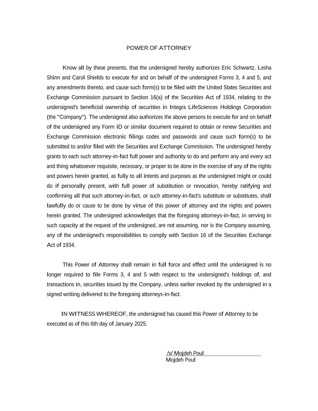 POWER OF ATTORNEY Know all by these presents, that the undersigned hereby authorizes Eric Schwartz, Lesha Shinn and Carol Shields to execute for and on behalf of the undersigned Forms 3, 4 and 5, and any amendments thereto, and cause such form(s) to be filed with the United States Securities and Exchange Commission pursuant to Section 16(a) of the Securities Act of 1934, relating to the undersigned's beneficial ownership of securities in Integra LifeSciences Holdings Corporation (the "Company"). The undersigned also authorizes the above persons to execute for and on behalf of the undersigned any Form ID or similar document required to obtain or renew Securities and Exchange Commission electronic filings codes and passwords and cause such form(s) to be submitted to and/or filed with the Securities and Exchange Commission. The undersigned hereby grants to each such attorney-in-fact full power and authority to do and perform any and every act and thing whatsoever requisite, necessary, or proper to be done in the exercise of any of the rights and powers herein granted, as fully to all intents and purposes as the undersigned might or could do if personally present, with full power of substitution or revocation, hereby ratifying and confirming all that such attorney-in-fact, or such attorney-in-fact's substitute or substitutes, shall lawfully do or cause to be done by virtue of this power of attorney and the rights and powers herein granted. The undersigned acknowledges that the foregoing attorneys-in-fact, in serving in such capacity at the request of the undersigned, are not assuming, nor is the Company assuming, any of the undersigned's responsibilities to comply with Section 16 of the Securities Exchange Act of 1934. This Power of Attorney shall remain in full force and effect until the undersigned is no longer required to file Forms 3, 4 and 5 with respect to the undersigned's holdings of, and transactions in, securities issued by the Company, unless earlier revoked by the undersigned in a signed writing delivered to the foregoing attorneys-in-fact. IN WITNESS WHEREOF, the undersigned has caused this Power of Attorney to be executed as of this 6th day of January 2025. /s/ Mojdeh Poul Mojdeh Poul