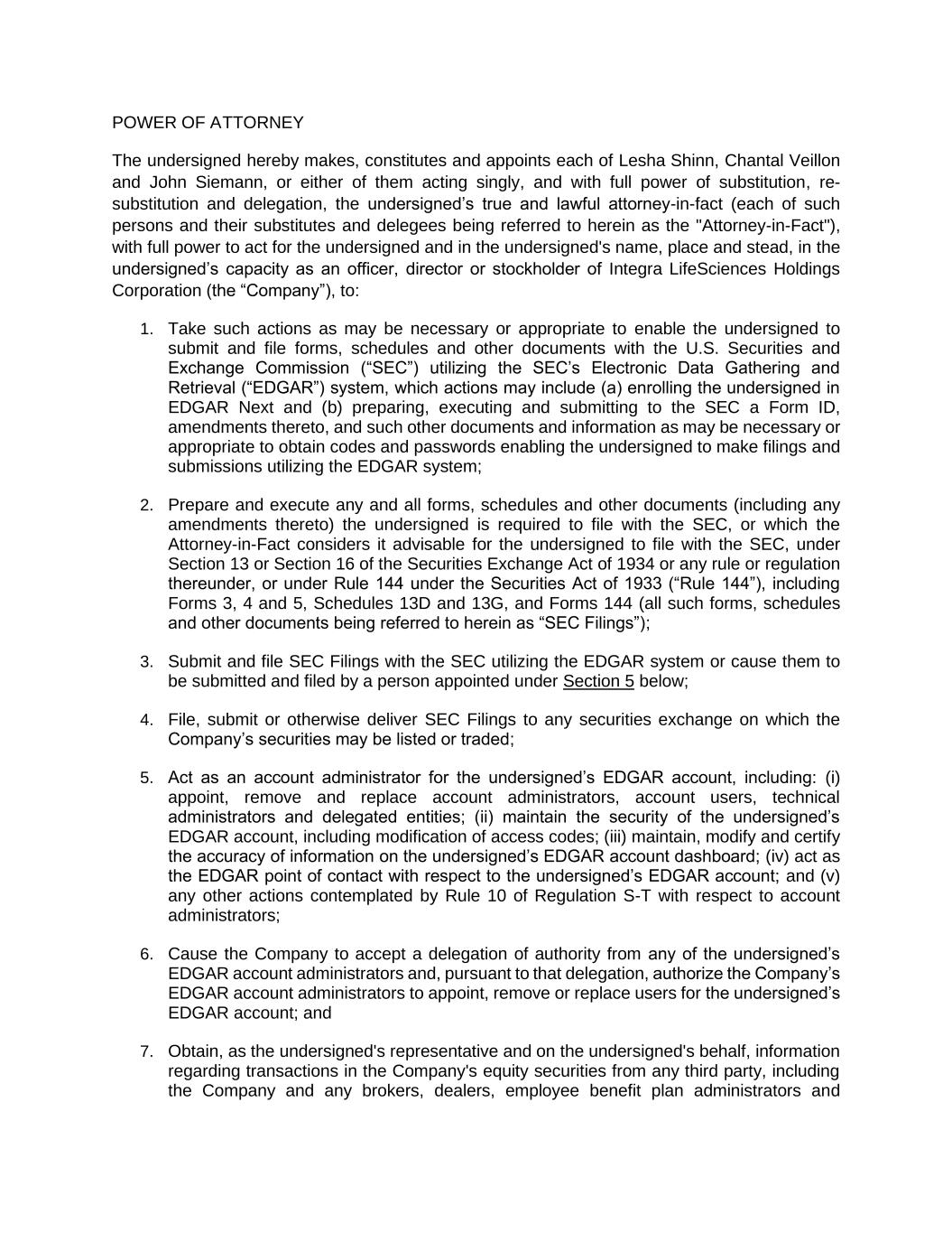 POWER OF ATTORNEY The undersigned hereby makes, constitutes and appoints each of Lesha Shinn, Chantal Veillon and John Siemann, or either of them acting singly, and with full power of substitution, re- substitution and delegation, the undersigned’s true and lawful attorney-in-fact (each of such persons and their substitutes and delegees being referred to herein as the "Attorney-in-Fact"), with full power to act for the undersigned and in the undersigned's name, place and stead, in the undersigned’s capacity as an officer, director or stockholder of Integra LifeSciences Holdings Corporation (the “Company”), to: 1. Take such actions as may be necessary or appropriate to enable the undersigned to submit and file forms, schedules and other documents with the U.S. Securities and Exchange Commission (“SEC”) utilizing the SEC’s Electronic Data Gathering and Retrieval (“EDGAR”) system, which actions may include (a) enrolling the undersigned in EDGAR Next and (b) preparing, executing and submitting to the SEC a Form ID, amendments thereto, and such other documents and information as may be necessary or appropriate to obtain codes and passwords enabling the undersigned to make filings and submissions utilizing the EDGAR system; 2. Prepare and execute any and all forms, schedules and other documents (including any amendments thereto) the undersigned is required to file with the SEC, or which the Attorney-in-Fact considers it advisable for the undersigned to file with the SEC, under Section 13 or Section 16 of the Securities Exchange Act of 1934 or any rule or regulation thereunder, or under Rule 144 under the Securities Act of 1933 (“Rule 144”), including Forms 3, 4 and 5, Schedules 13D and 13G, and Forms 144 (all such forms, schedules and other documents being referred to herein as “SEC Filings”); 3. Submit and file SEC Filings with the SEC utilizing the EDGAR system or cause them to be submitted and filed by a person appointed under Section 5 below; 4. File, submit or otherwise deliver SEC Filings to any securities exchange on which the Company’s securities may be listed or traded; 5. Act as an account administrator for the undersigned’s EDGAR account, including: (i) appoint, remove and replace account administrators, account users, technical administrators and delegated entities; (ii) maintain the security of the undersigned’s EDGAR account, including modification of access codes; (iii) maintain, modify and certify the accuracy of information on the undersigned’s EDGAR account dashboard; (iv) act as the EDGAR point of contact with respect to the undersigned’s EDGAR account; and (v) any other actions contemplated by Rule 10 of Regulation S-T with respect to account administrators; 6. Cause the Company to accept a delegation of authority from any of the undersigned’s EDGAR account administrators and, pursuant to that delegation, authorize the Company’s EDGAR account administrators to appoint, remove or replace users for the undersigned’s EDGAR account; and 7. Obtain, as the undersigned's representative and on the undersigned's behalf, information regarding transactions in the Company's equity securities from any third party, including the Company and any brokers, dealers, employee benefit plan administrators and