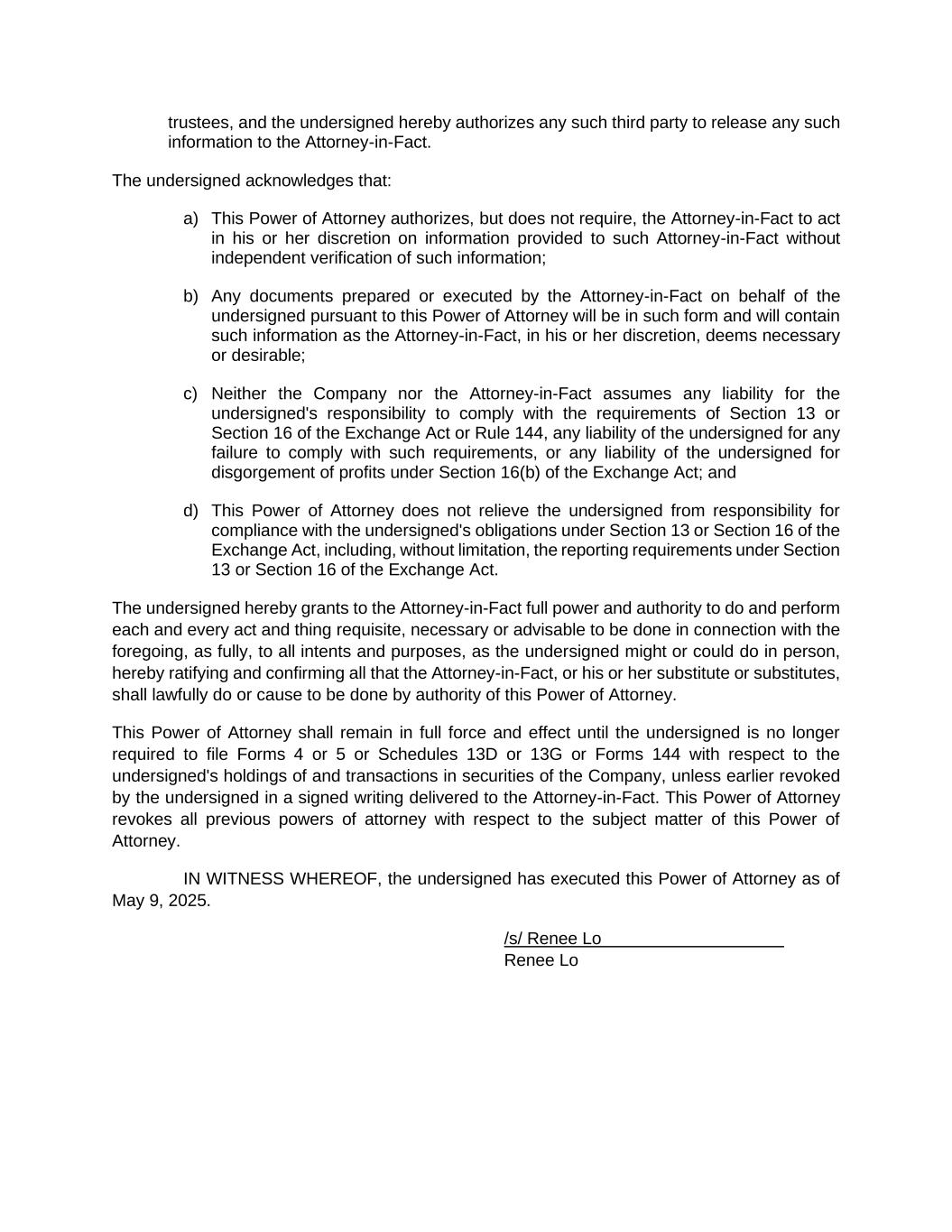 trustees, and the undersigned hereby authorizes any such third party to release any such information to the Attorney-in-Fact. The undersigned acknowledges that: a) This Power of Attorney authorizes, but does not require, the Attorney-in-Fact to act in his or her discretion on information provided to such Attorney-in-Fact without independent verification of such information; b) Any documents prepared or executed by the Attorney-in-Fact on behalf of the undersigned pursuant to this Power of Attorney will be in such form and will contain such information as the Attorney-in-Fact, in his or her discretion, deems necessary or desirable; c) Neither the Company nor the Attorney-in-Fact assumes any liability for the undersigned's responsibility to comply with the requirements of Section 13 or Section 16 of the Exchange Act or Rule 144, any liability of the undersigned for any failure to comply with such requirements, or any liability of the undersigned for disgorgement of profits under Section 16(b) of the Exchange Act; and d) This Power of Attorney does not relieve the undersigned from responsibility for compliance with the undersigned's obligations under Section 13 or Section 16 of the Exchange Act, including, without limitation, the reporting requirements under Section 13 or Section 16 of the Exchange Act. The undersigned hereby grants to the Attorney-in-Fact full power and authority to do and perform each and every act and thing requisite, necessary or advisable to be done in connection with the foregoing, as fully, to all intents and purposes, as the undersigned might or could do in person, hereby ratifying and confirming all that the Attorney-in-Fact, or his or her substitute or substitutes, shall lawfully do or cause to be done by authority of this Power of Attorney. This Power of Attorney shall remain in full force and effect until the undersigned is no longer required to file Forms 4 or 5 or Schedules 13D or 13G or Forms 144 with respect to the undersigned's holdings of and transactions in securities of the Company, unless earlier revoked by the undersigned in a signed writing delivered to the Attorney-in-Fact. This Power of Attorney revokes all previous powers of attorney with respect to the subject matter of this Power of Attorney. IN WITNESS WHEREOF, the undersigned has executed this Power of Attorney as of May 9, 2025. /s/ Renee Lo Renee Lo