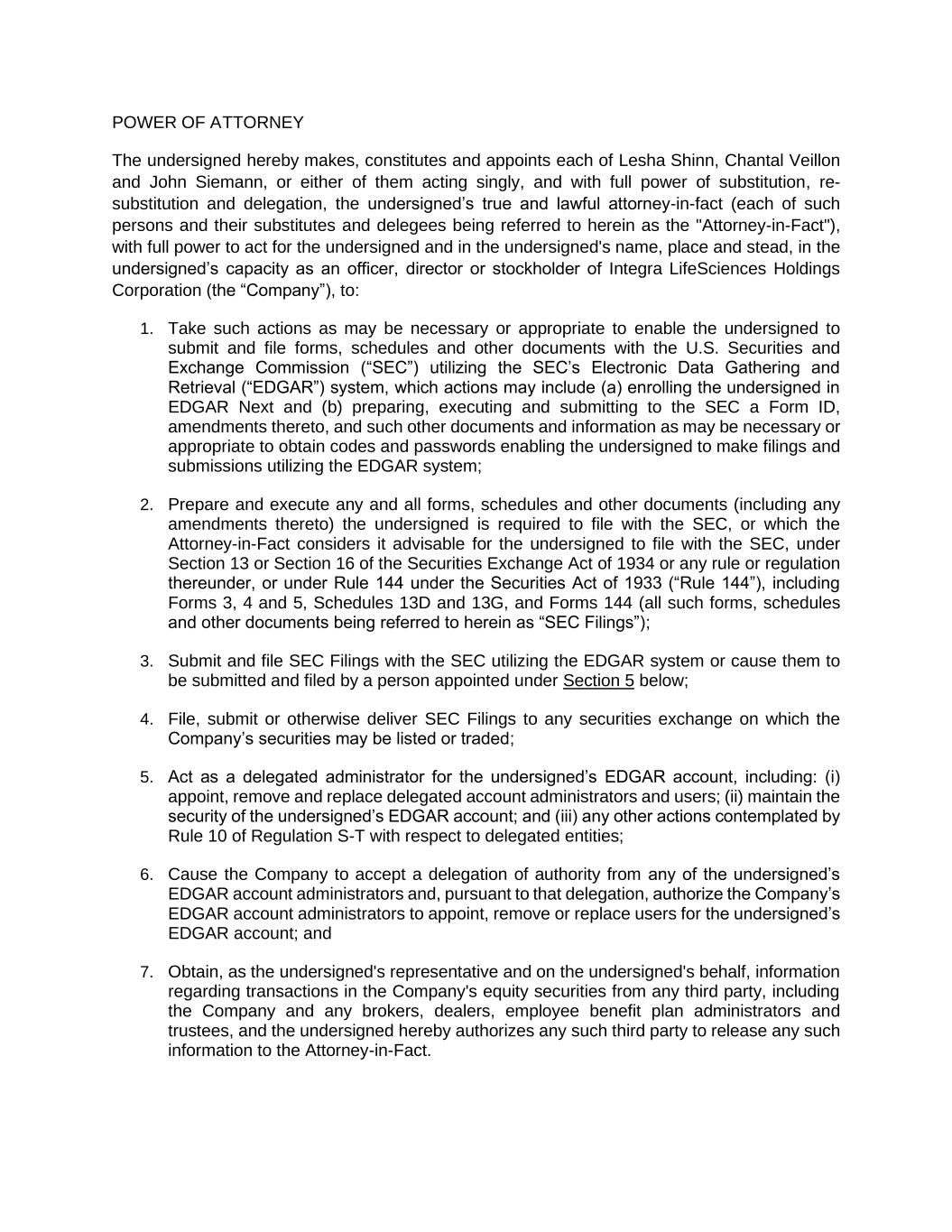 POWER OF ATTORNEY The undersigned hereby makes, constitutes and appoints each of Lesha Shinn, Chantal Veillon and John Siemann, or either of them acting singly, and with full power of substitution, re- substitution and delegation, the undersigned’s true and lawful attorney-in-fact (each of such persons and their substitutes and delegees being referred to herein as the "Attorney-in-Fact"), with full power to act for the undersigned and in the undersigned's name, place and stead, in the undersigned’s capacity as an officer, director or stockholder of Integra LifeSciences Holdings Corporation (the “Company”), to: 1. Take such actions as may be necessary or appropriate to enable the undersigned to submit and file forms, schedules and other documents with the U.S. Securities and Exchange Commission (“SEC”) utilizing the SEC’s Electronic Data Gathering and Retrieval (“EDGAR”) system, which actions may include (a) enrolling the undersigned in EDGAR Next and (b) preparing, executing and submitting to the SEC a Form ID, amendments thereto, and such other documents and information as may be necessary or appropriate to obtain codes and passwords enabling the undersigned to make filings and submissions utilizing the EDGAR system; 2. Prepare and execute any and all forms, schedules and other documents (including any amendments thereto) the undersigned is required to file with the SEC, or which the Attorney-in-Fact considers it advisable for the undersigned to file with the SEC, under Section 13 or Section 16 of the Securities Exchange Act of 1934 or any rule or regulation thereunder, or under Rule 144 under the Securities Act of 1933 (“Rule 144”), including Forms 3, 4 and 5, Schedules 13D and 13G, and Forms 144 (all such forms, schedules and other documents being referred to herein as “SEC Filings”); 3. Submit and file SEC Filings with the SEC utilizing the EDGAR system or cause them to be submitted and filed by a person appointed under Section 5 below; 4. File, submit or otherwise deliver SEC Filings to any securities exchange on which the Company’s securities may be listed or traded; 5. Act as a delegated administrator for the undersigned’s EDGAR account, including: (i) appoint, remove and replace delegated account administrators and users; (ii) maintain the security of the undersigned’s EDGAR account; and (iii) any other actions contemplated by Rule 10 of Regulation S-T with respect to delegated entities; 6. Cause the Company to accept a delegation of authority from any of the undersigned’s EDGAR account administrators and, pursuant to that delegation, authorize the Company’s EDGAR account administrators to appoint, remove or replace users for the undersigned’s EDGAR account; and 7. Obtain, as the undersigned's representative and on the undersigned's behalf, information regarding transactions in the Company's equity securities from any third party, including the Company and any brokers, dealers, employee benefit plan administrators and trustees, and the undersigned hereby authorizes any such third party to release any such information to the Attorney-in-Fact.
