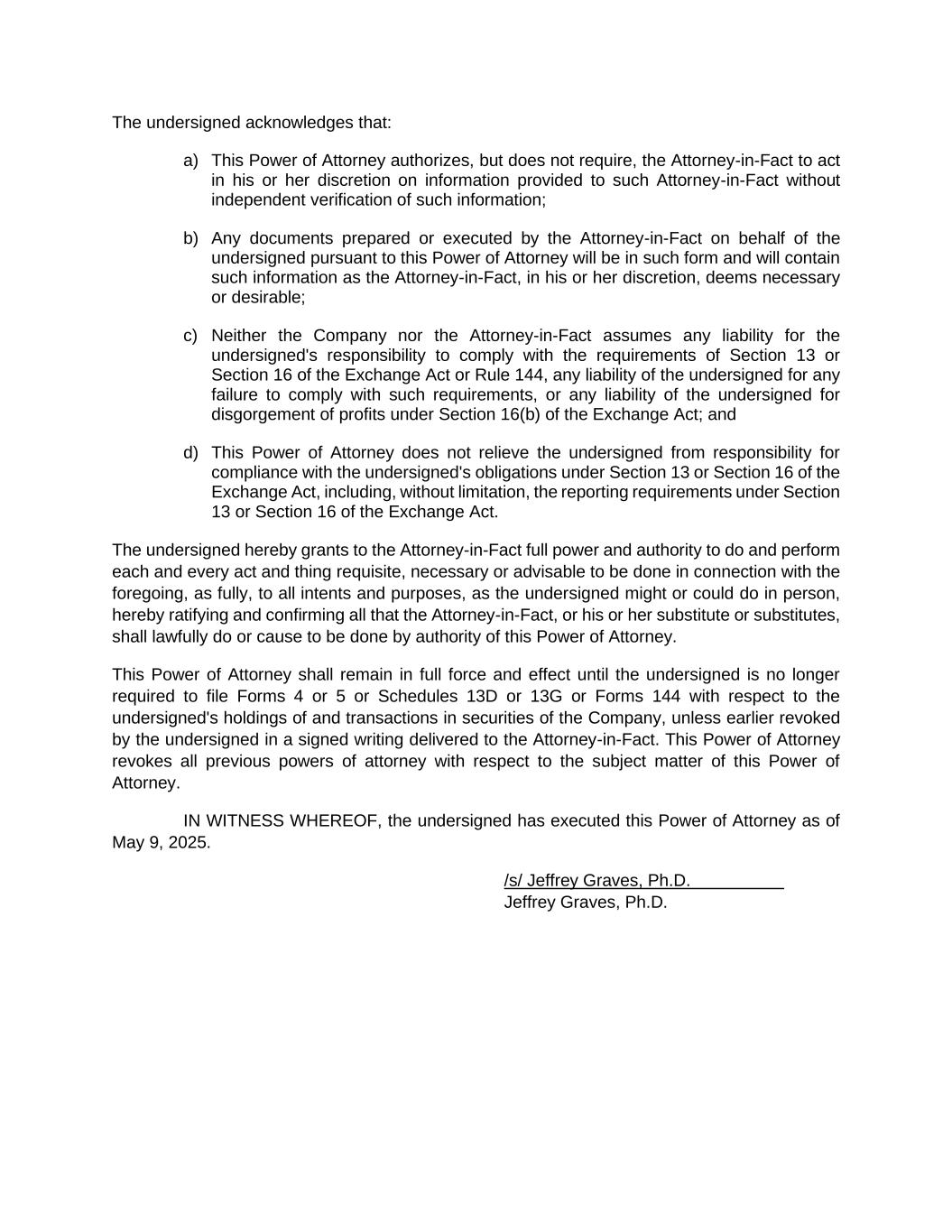 The undersigned acknowledges that: a) This Power of Attorney authorizes, but does not require, the Attorney-in-Fact to act in his or her discretion on information provided to such Attorney-in-Fact without independent verification of such information; b) Any documents prepared or executed by the Attorney-in-Fact on behalf of the undersigned pursuant to this Power of Attorney will be in such form and will contain such information as the Attorney-in-Fact, in his or her discretion, deems necessary or desirable; c) Neither the Company nor the Attorney-in-Fact assumes any liability for the undersigned's responsibility to comply with the requirements of Section 13 or Section 16 of the Exchange Act or Rule 144, any liability of the undersigned for any failure to comply with such requirements, or any liability of the undersigned for disgorgement of profits under Section 16(b) of the Exchange Act; and d) This Power of Attorney does not relieve the undersigned from responsibility for compliance with the undersigned's obligations under Section 13 or Section 16 of the Exchange Act, including, without limitation, the reporting requirements under Section 13 or Section 16 of the Exchange Act. The undersigned hereby grants to the Attorney-in-Fact full power and authority to do and perform each and every act and thing requisite, necessary or advisable to be done in connection with the foregoing, as fully, to all intents and purposes, as the undersigned might or could do in person, hereby ratifying and confirming all that the Attorney-in-Fact, or his or her substitute or substitutes, shall lawfully do or cause to be done by authority of this Power of Attorney. This Power of Attorney shall remain in full force and effect until the undersigned is no longer required to file Forms 4 or 5 or Schedules 13D or 13G or Forms 144 with respect to the undersigned's holdings of and transactions in securities of the Company, unless earlier revoked by the undersigned in a signed writing delivered to the Attorney-in-Fact. This Power of Attorney revokes all previous powers of attorney with respect to the subject matter of this Power of Attorney. IN WITNESS WHEREOF, the undersigned has executed this Power of Attorney as of May 9, 2025. /s/ Jeffrey Graves, Ph.D. Jeffrey Graves, Ph.D.
