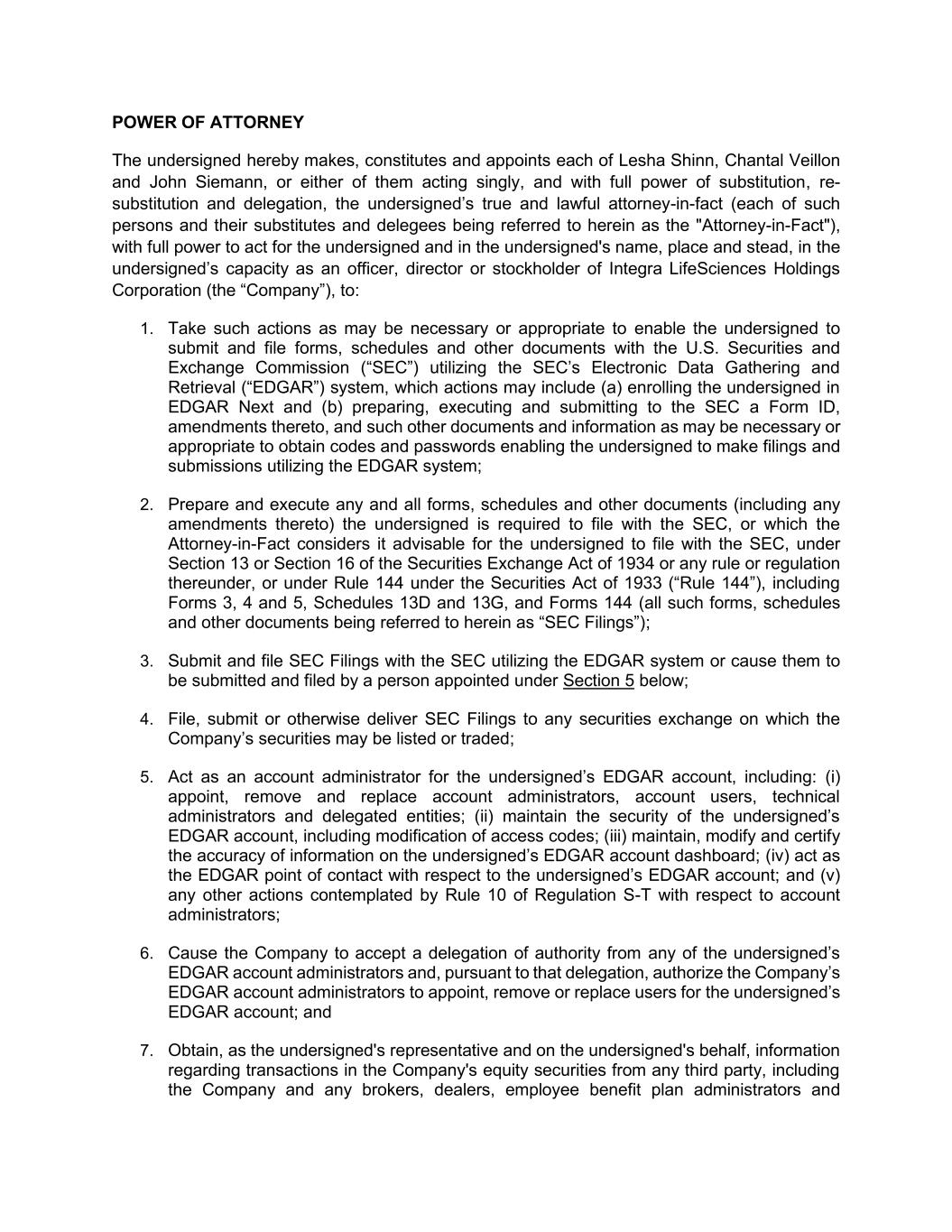 POWER OF ATTORNEY The undersigned hereby makes, constitutes and appoints each of Lesha Shinn, Chantal Veillon and John Siemann, or either of them acting singly, and with full power of substitution, re- substitution and delegation, the undersigned’s true and lawful attorney-in-fact (each of such persons and their substitutes and delegees being referred to herein as the "Attorney-in-Fact"), with full power to act for the undersigned and in the undersigned's name, place and stead, in the undersigned’s capacity as an officer, director or stockholder of Integra LifeSciences Holdings Corporation (the “Company”), to: 1. Take such actions as may be necessary or appropriate to enable the undersigned to submit and file forms, schedules and other documents with the U.S. Securities and Exchange Commission (“SEC”) utilizing the SEC’s Electronic Data Gathering and Retrieval (“EDGAR”) system, which actions may include (a) enrolling the undersigned in EDGAR Next and (b) preparing, executing and submitting to the SEC a Form ID, amendments thereto, and such other documents and information as may be necessary or appropriate to obtain codes and passwords enabling the undersigned to make filings and submissions utilizing the EDGAR system; 2. Prepare and execute any and all forms, schedules and other documents (including any amendments thereto) the undersigned is required to file with the SEC, or which the Attorney-in-Fact considers it advisable for the undersigned to file with the SEC, under Section 13 or Section 16 of the Securities Exchange Act of 1934 or any rule or regulation thereunder, or under Rule 144 under the Securities Act of 1933 (“Rule 144”), including Forms 3, 4 and 5, Schedules 13D and 13G, and Forms 144 (all such forms, schedules and other documents being referred to herein as “SEC Filings”); 3. Submit and file SEC Filings with the SEC utilizing the EDGAR system or cause them to be submitted and filed by a person appointed under Section 5 below; 4. File, submit or otherwise deliver SEC Filings to any securities exchange on which the Company’s securities may be listed or traded; 5. Act as an account administrator for the undersigned’s EDGAR account, including: (i) appoint, remove and replace account administrators, account users, technical administrators and delegated entities; (ii) maintain the security of the undersigned’s EDGAR account, including modification of access codes; (iii) maintain, modify and certify the accuracy of information on the undersigned’s EDGAR account dashboard; (iv) act as the EDGAR point of contact with respect to the undersigned’s EDGAR account; and (v) any other actions contemplated by Rule 10 of Regulation S-T with respect to account administrators; 6. Cause the Company to accept a delegation of authority from any of the undersigned’s EDGAR account administrators and, pursuant to that delegation, authorize the Company’s EDGAR account administrators to appoint, remove or replace users for the undersigned’s EDGAR account; and 7. Obtain, as the undersigned's representative and on the undersigned's behalf, information regarding transactions in the Company's equity securities from any third party, including the Company and any brokers, dealers, employee benefit plan administrators and