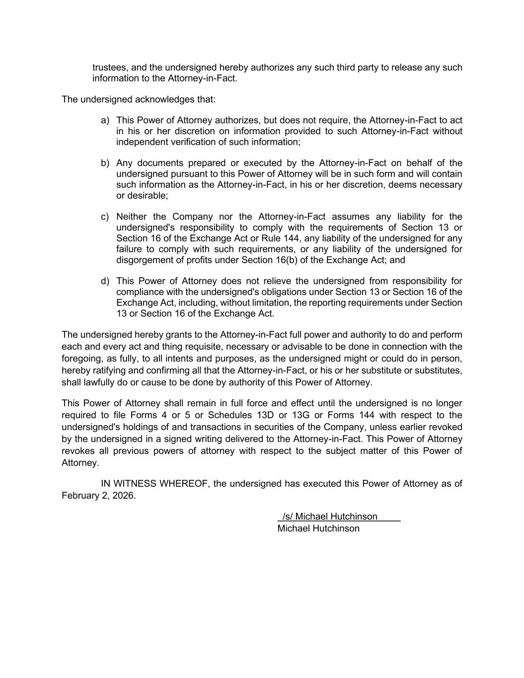 trustees, and the undersigned hereby authorizes any such third party to release any such information to the Attorney-in-Fact. The undersigned acknowledges that: a) This Power of Attorney authorizes, but does not require, the Attorney-in-Fact to act in his or her discretion on information provided to such Attorney-in-Fact without independent verification of such information; b) Any documents prepared or executed by the Attorney-in-Fact on behalf of the undersigned pursuant to this Power of Attorney will be in such form and will contain such information as the Attorney-in-Fact, in his or her discretion, deems necessary or desirable; c) Neither the Company nor the Attorney-in-Fact assumes any liability for the undersigned's responsibility to comply with the requirements of Section 13 or Section 16 of the Exchange Act or Rule 144, any liability of the undersigned for any failure to comply with such requirements, or any liability of the undersigned for disgorgement of profits under Section 16(b) of the Exchange Act; and d) This Power of Attorney does not relieve the undersigned from responsibility for compliance with the undersigned's obligations under Section 13 or Section 16 of the Exchange Act, including, without limitation, the reporting requirements under Section 13 or Section 16 of the Exchange Act. The undersigned hereby grants to the Attorney-in-Fact full power and authority to do and perform each and every act and thing requisite, necessary or advisable to be done in connection with the foregoing, as fully, to all intents and purposes, as the undersigned might or could do in person, hereby ratifying and confirming all that the Attorney-in-Fact, or his or her substitute or substitutes, shall lawfully do or cause to be done by authority of this Power of Attorney. This Power of Attorney shall remain in full force and effect until the undersigned is no longer required to file Forms 4 or 5 or Schedules 13D or 13G or Forms 144 with respect to the undersigned's holdings of and transactions in securities of the Company, unless earlier revoked by the undersigned in a signed writing delivered to the Attorney-in-Fact. This Power of Attorney revokes all previous powers of attorney with respect to the subject matter of this Power of Attorney. IN WITNESS WHEREOF, the undersigned has executed this Power of Attorney as of February 2, 2026. /s/ Michael Hutchinson Michael Hutchinson